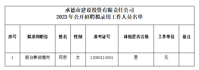 根據(jù)2023年度承德市建設(shè)投資有限責(zé)任公司公開招聘工作人員的相關(guān)要求,經(jīng)過筆試、面試、體檢和考察等程序,確定司思同志為承德市建設(shè)投資有限責(zé)任公司擬錄用工作人員,現(xiàn)予以公示。公示期間如有異議,可通過電話、信函等方式反映,反映意見請署真實姓名。